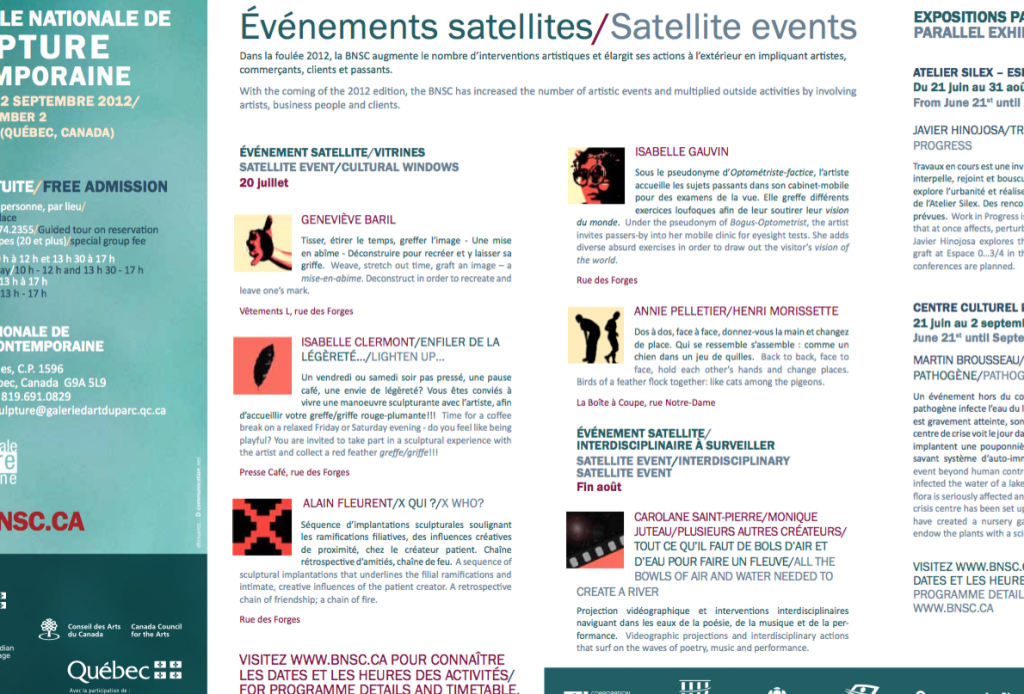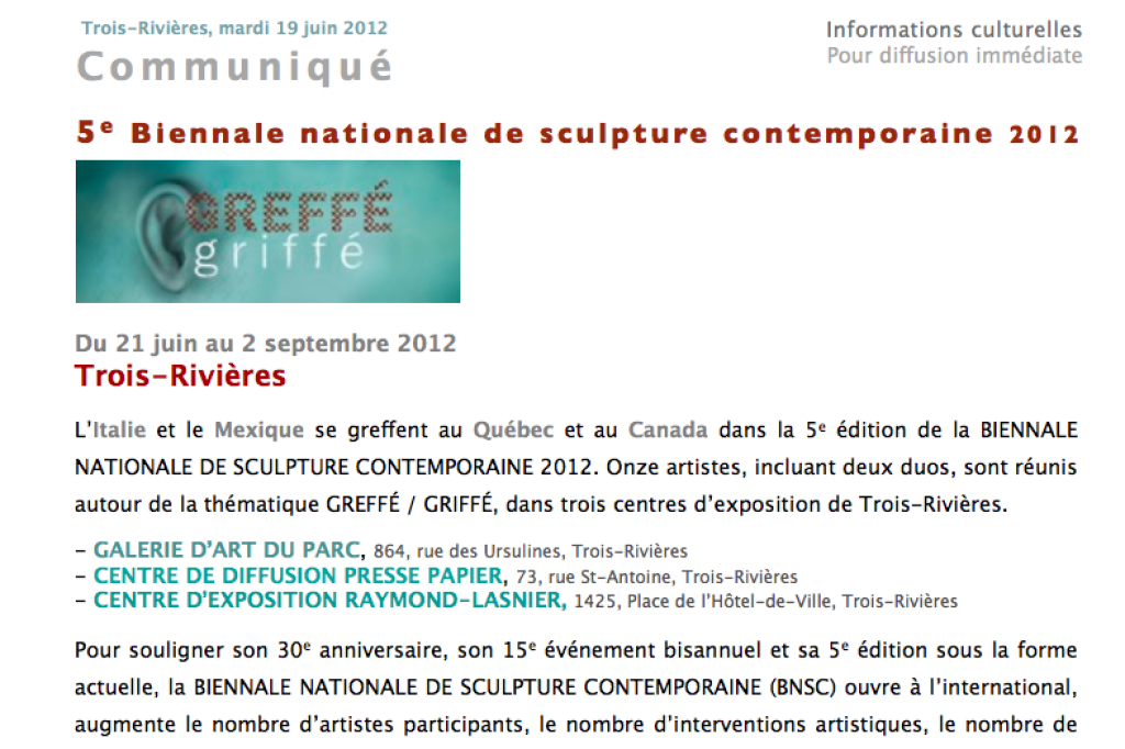 L'Italie et le Mexique se greffent au Québec et au Canada dans la 5e édition de la BIENNALE NATIONALE DE SCULPTURE CONTEMPORAINE 2012.Onze artistes, incluant deux duos, sont réunis autour de la thématique GREFFÉ / GRIFFÉ, dans trois centres d’exposition de Trois-Rivières.