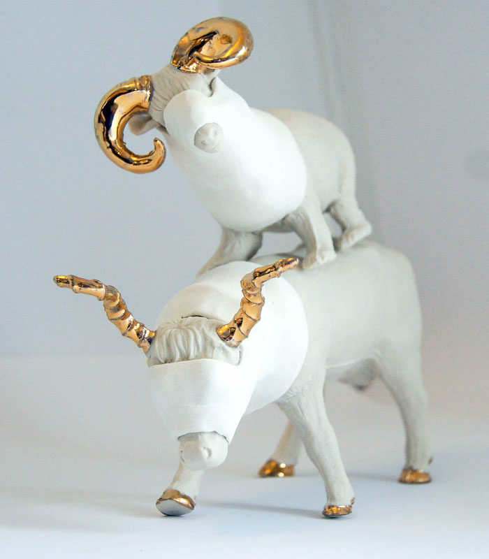 L’œuvre Migration de Janet Macpherson est créée à partir de jouets trouvés que l’artiste a d’abord démontés, réassemblés et enveloppés dans de fines couches de porcelaine, puis dont elle a fait un moulage. La feuille d’or appliquée aux cornes des animaux rappelle la mythologie grecque et les représentations chrétiennes du Moyen Âge. Les expressions de chacune des figures suscitent instantanément l’empathie du public, qui ne peut s’empêcher de remarquer le savoir-faire de l’artiste.